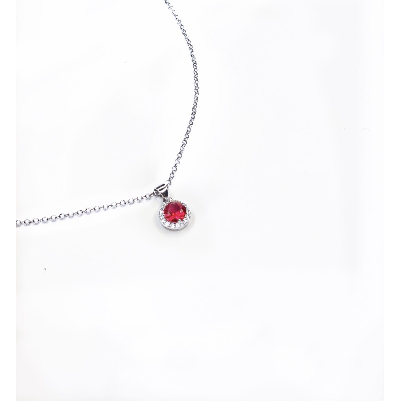 Collana Catena Forzatina Diamantata Punto Luce Bianco e Tondo Rosso Rubino contornato da Cubic Zirconia Bianchi in ARGENTO 925 Galvanica Rodio