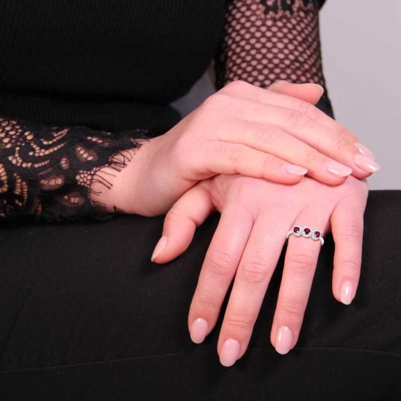 Anello Trilogy con Zirconi Rosso Rubino contornati con Zirconi Bianchi in ARGENTO 925 Galvanica Rodio